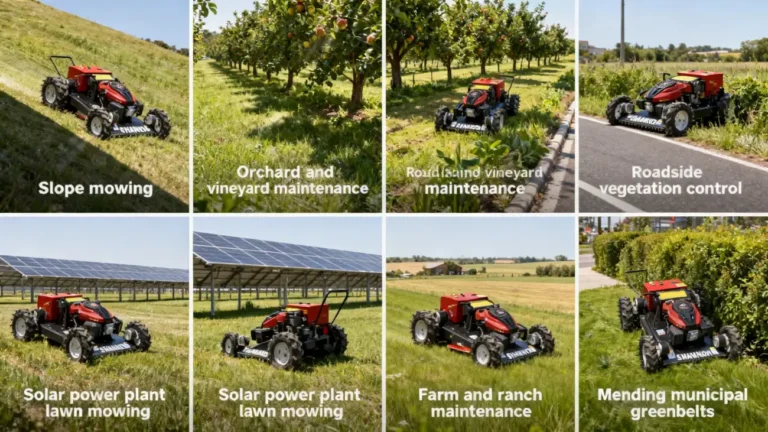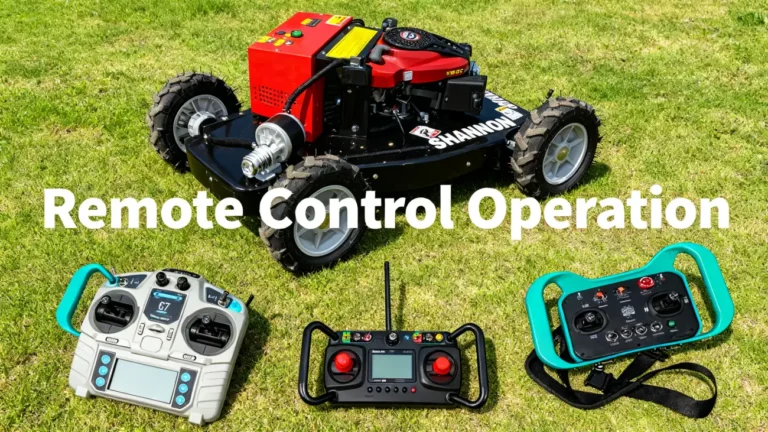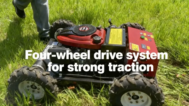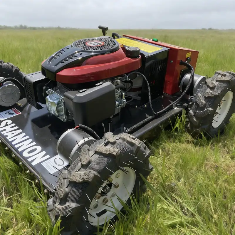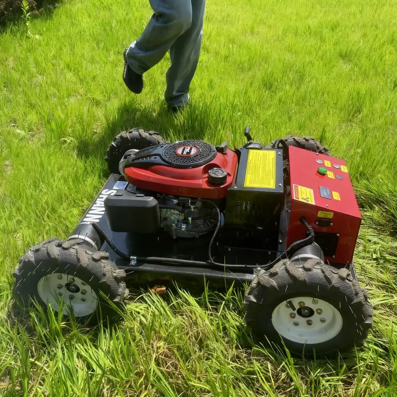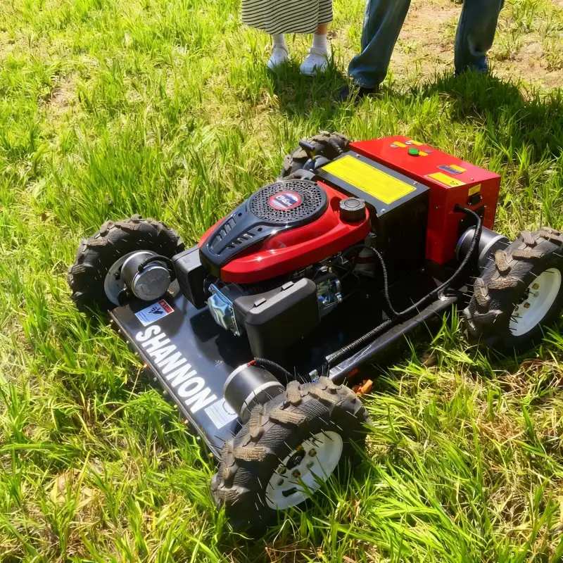 The SN-550S remote control lawn mower is a powerful four-wheel drive gasoline brush cutter designed for slope mowing, thick grass trimming, orchard maintenance, and vegetation management in challenging terrain.